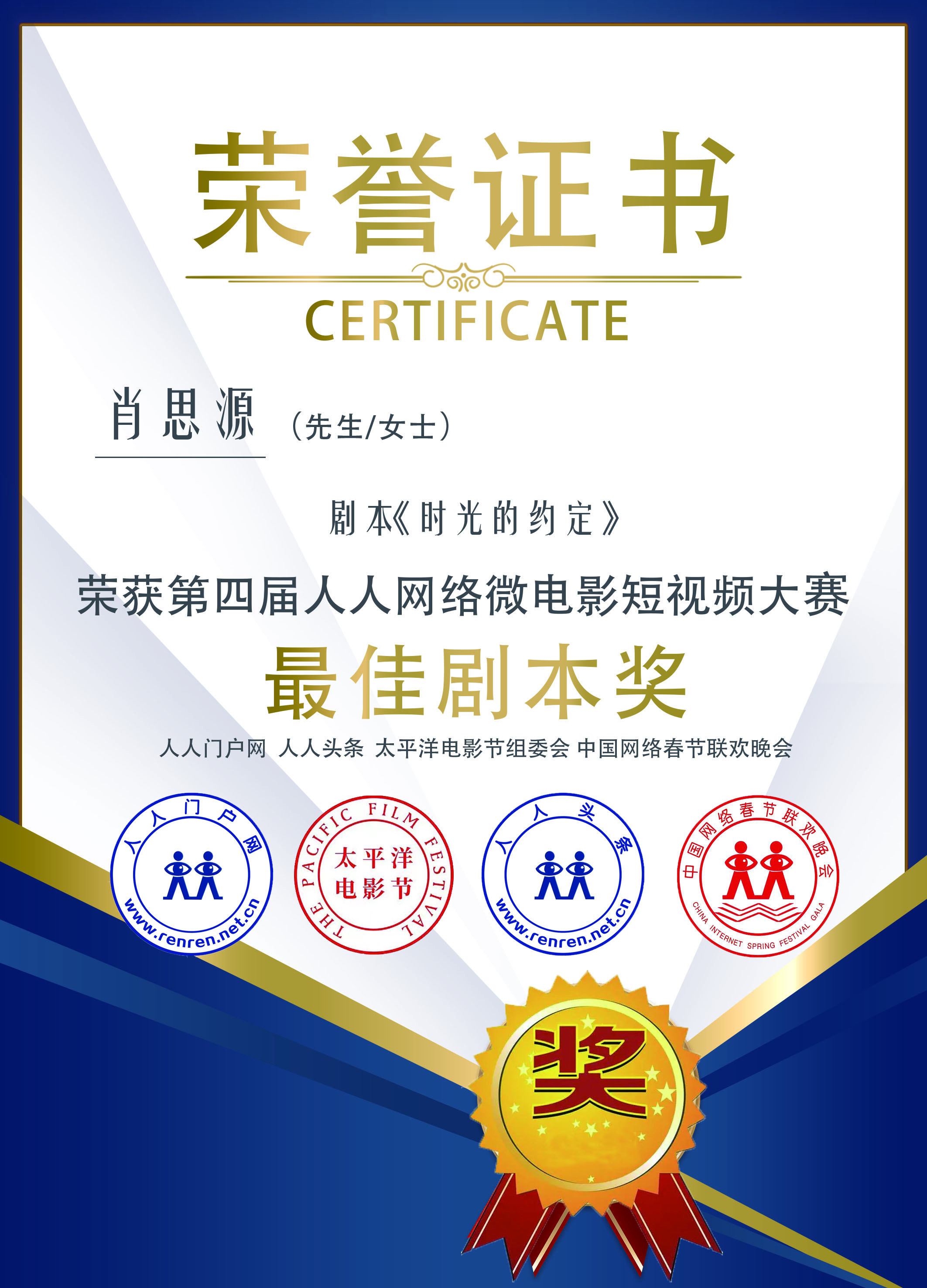 零零后韩国留学生肖思源剧本 《时光的约定》荣获第四届人人网络微电影短视频大赛最佳剧本奖