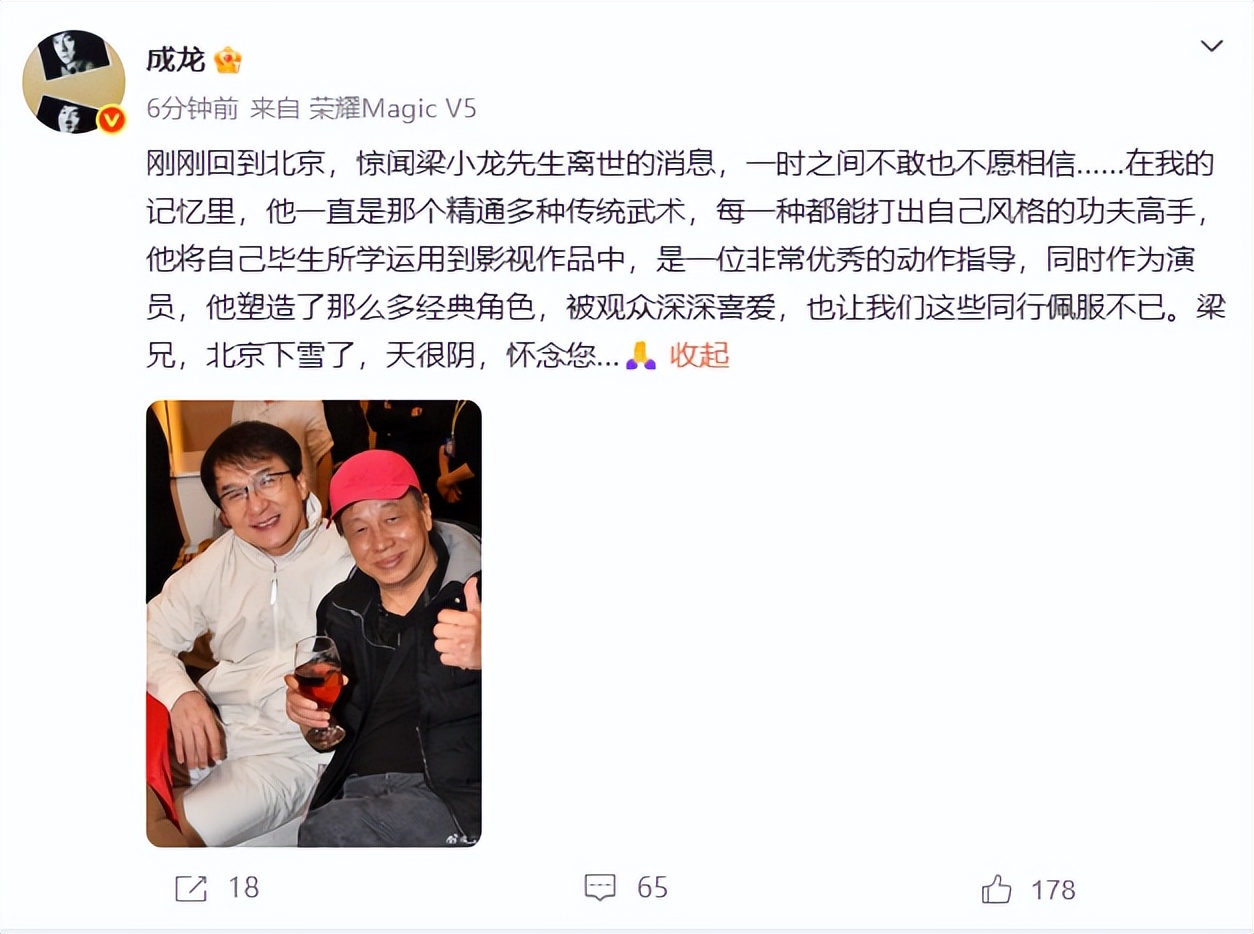 成龙发文悼念:“惊闻梁小龙先生离世的消息,一时之间不敢也不愿相信……在我的记忆里,他一直是那个精通多种传统武术,每一种都能打出自己风格的功夫高手,他将自己毕生所学运用到影视作品中,是一位非常优秀的动作指导,同时作为演员,他塑造了那么多经典角色,被观众深深喜爱,也让我们这些同行佩服不已。”