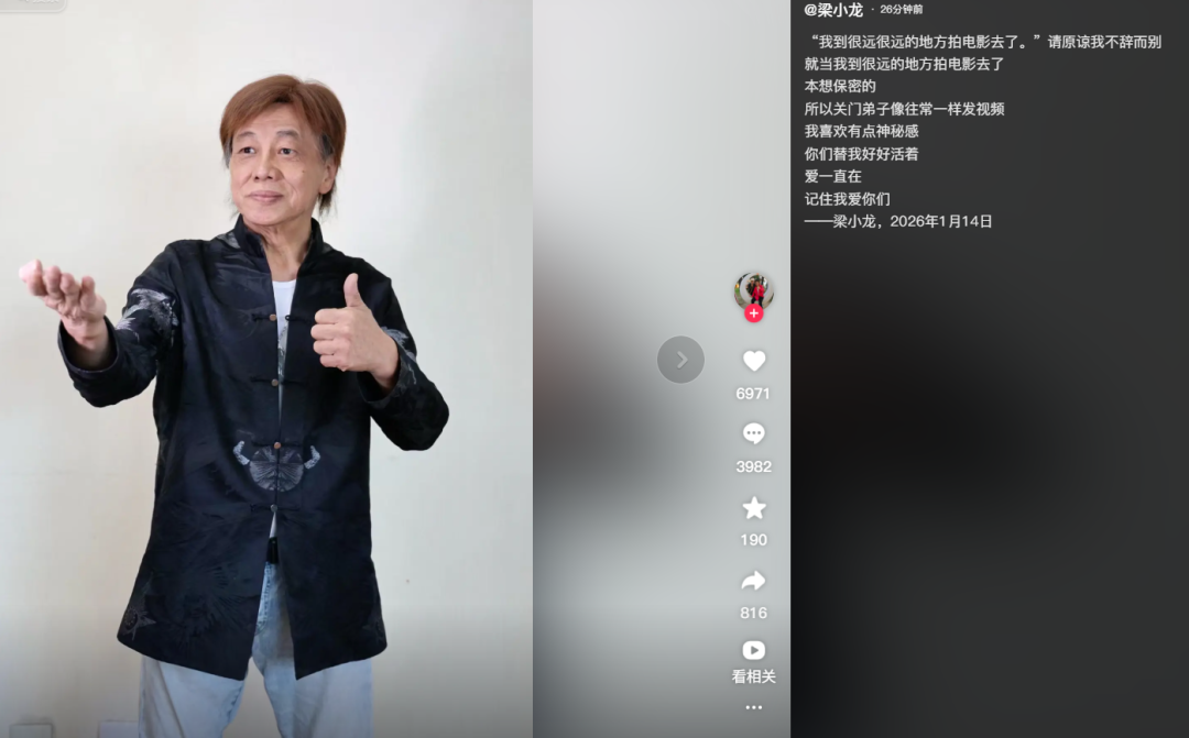 该账号写道:“请原谅我不辞而别 就当我到很远的地方拍电影去了 本想保密的 所以关门弟子像往常一样发视频 我喜欢有点神秘感 你们替我好好活着 爱一直在 记住我爱你们 ——梁小龙,2026年1月14日。”