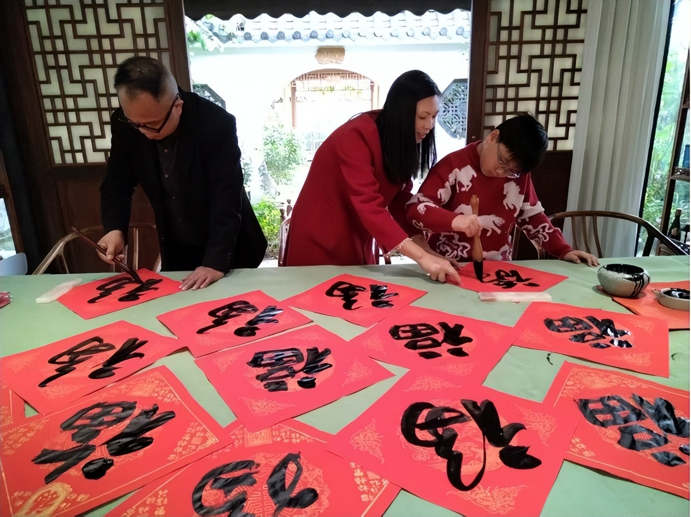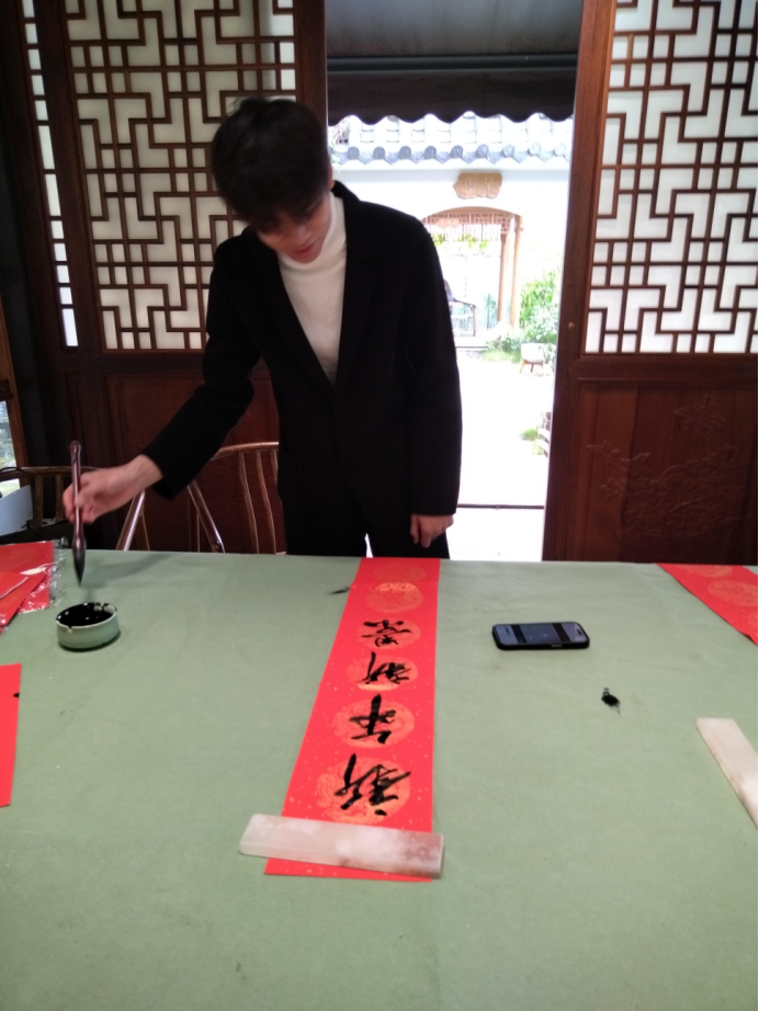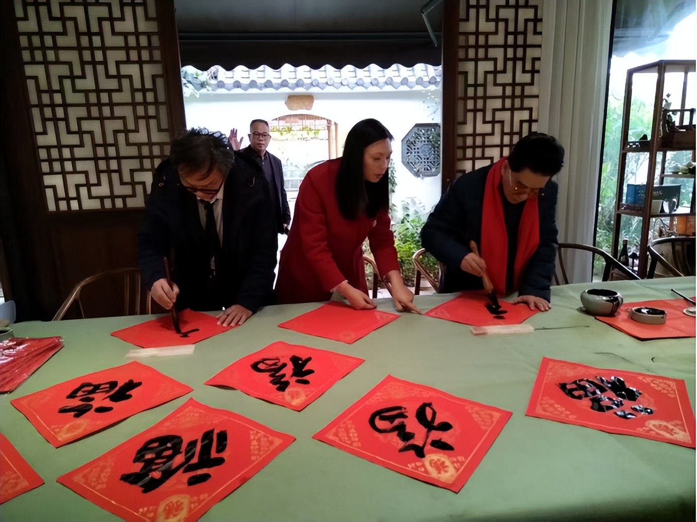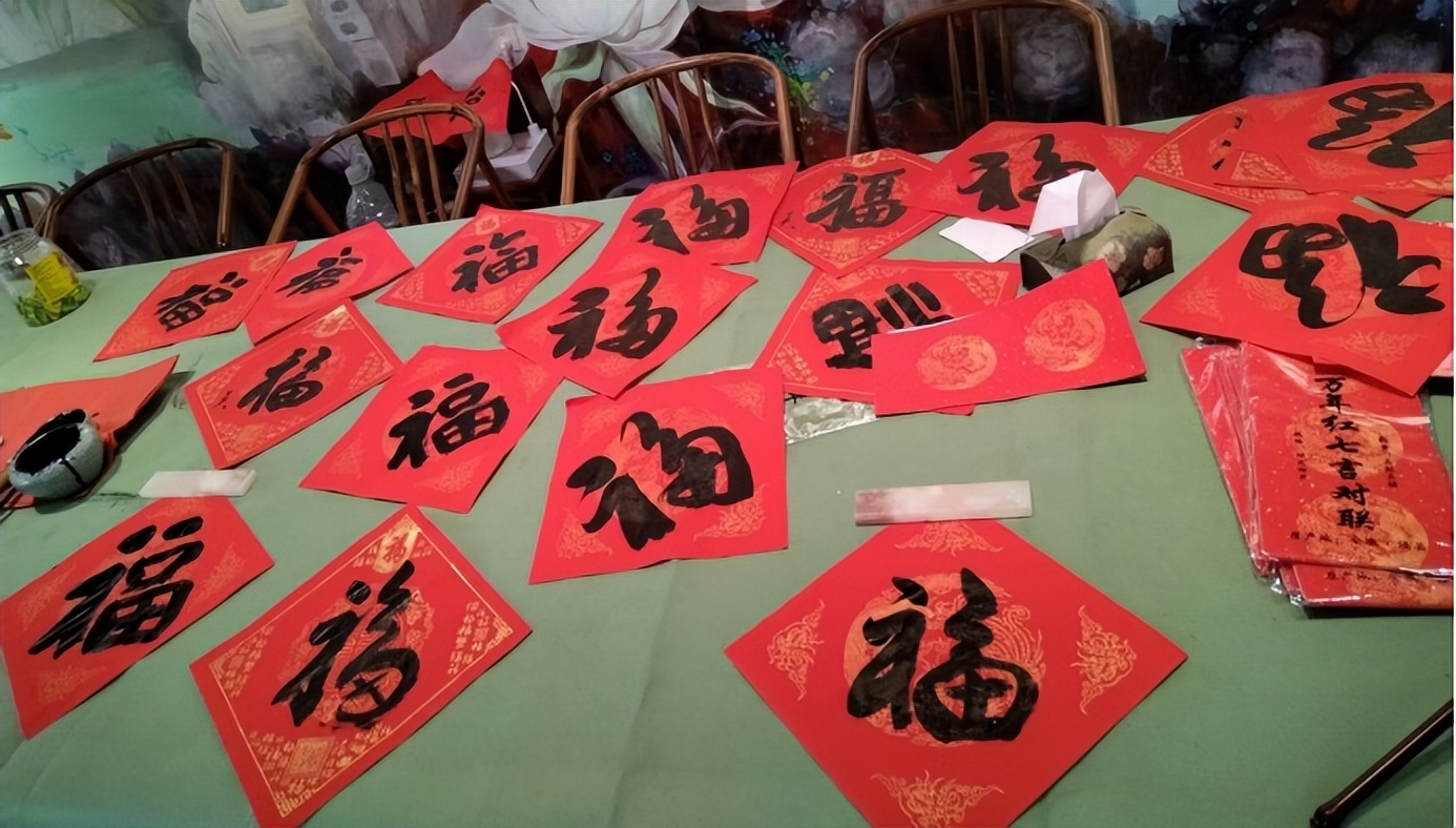 嘉宾们愉快的写春联,送“福”字