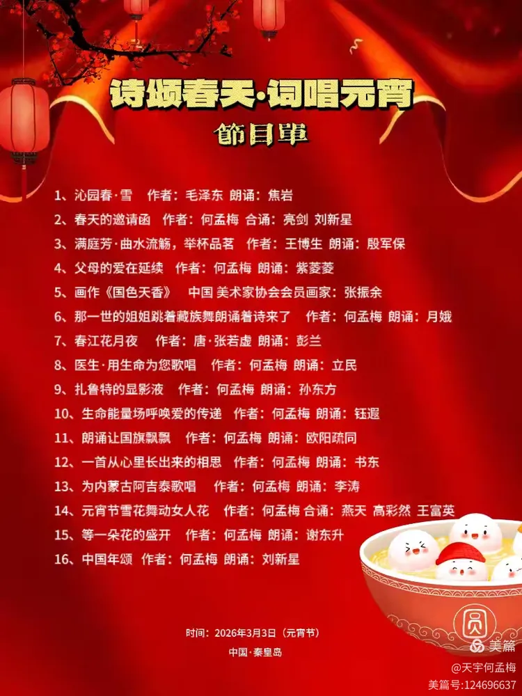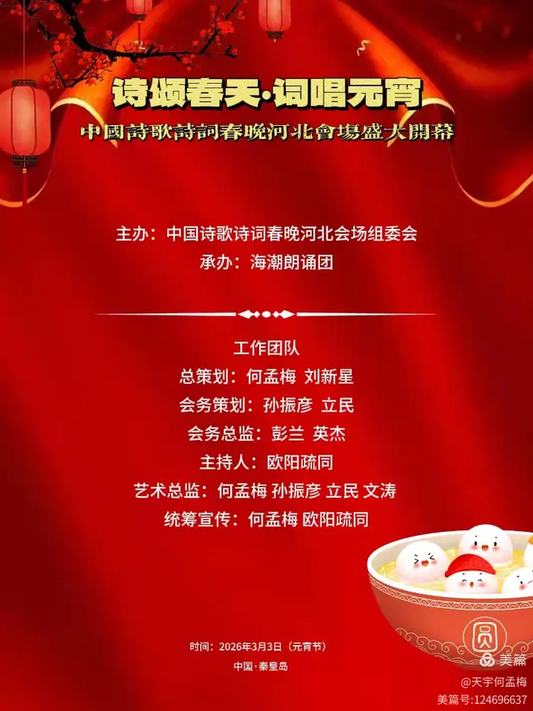 燕赵大地自古文脉昌盛,是中华诗词的沃土,千百年来,无数经典诗篇在此孕育、流传。新时代,我们举办诗歌诗词春晚,初衷便是传承中华文脉,而河北会场,正是这份传承中最具地域特色的重要一环。恰逢元宵良辰,我们以诗为媒、以节为契,让中华诗词的雅韵与元宵佳节的温情相融,让燕赵文脉在灯火阑珊中得以赓续。