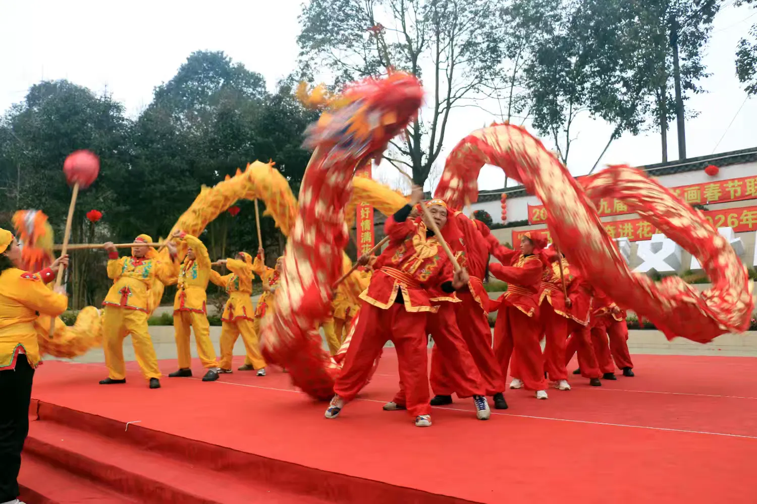 鼓点铿锵启新程,龙舞翩跹庆新春。活动在“龙腾堰上、快马花溪”主题舞龙表演中正式拉开帷幕,金黄长龙伴随着欢快的鼓点腾跃翻转、灵动穿梭,时而昂首摆尾,时而盘旋嬉戏,将“龙马精神”的昂扬姿态展现得淋漓尽致,瞬间点燃了现场的喜庆氛围,台下掌声、欢呼声此起彼伏,尽显新春佳节的热闹景象。