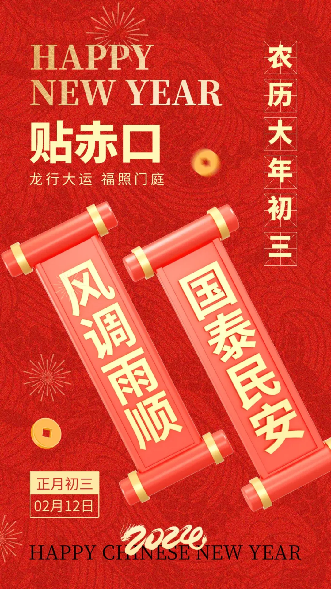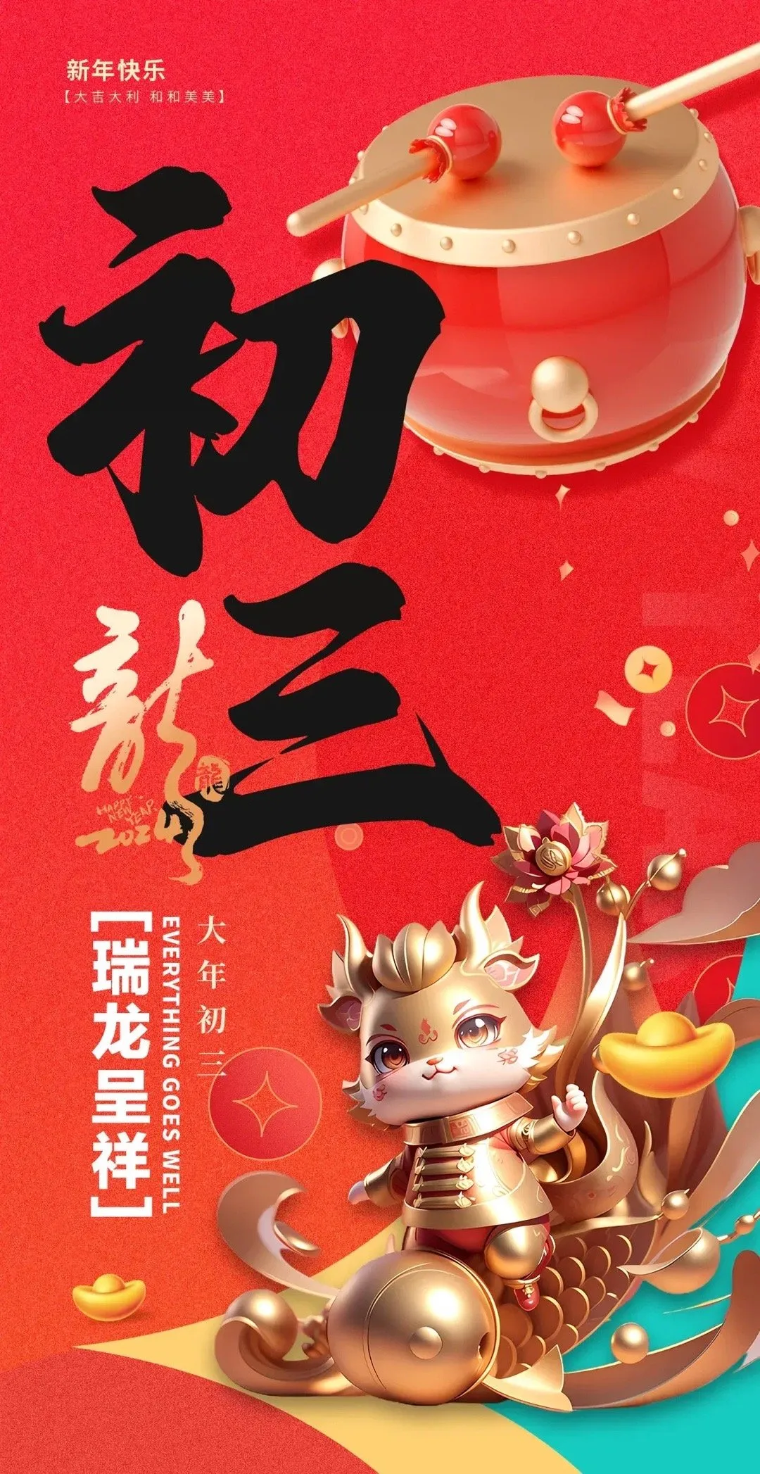 龙年大年初三,给您拜年!新年快乐,好事连连,好运不断!新的一年,我希望所有不好的,都能否极泰来;我希望所有遗憾的,都能回头补全;我希望所有伤感的,都能破涕为笑!新的一年,希望我们顺利平安,幸福满满,万事周全!