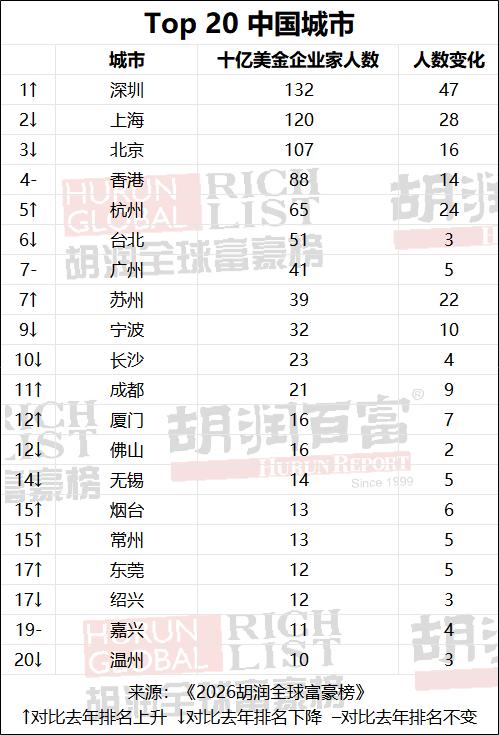 浙江力量在全球财富格局中持续走强。杭州作为阿里巴巴、农夫山泉、网易等企业总部所在地,集聚多位千亿级企业家,上榜人数稳居全国第五位,有65人上榜。宁波有32人上榜,位居全国前十位。另外。绍兴(12人)、嘉兴(11人)、温州(10人)也位居全国前20位。