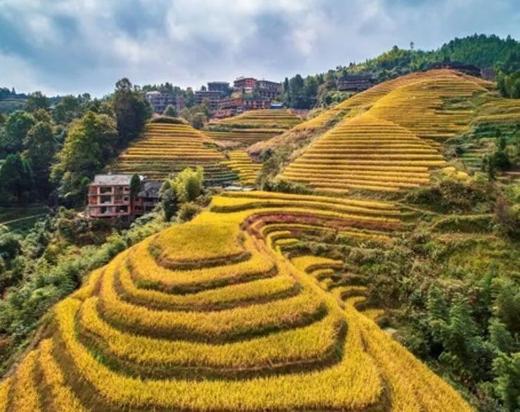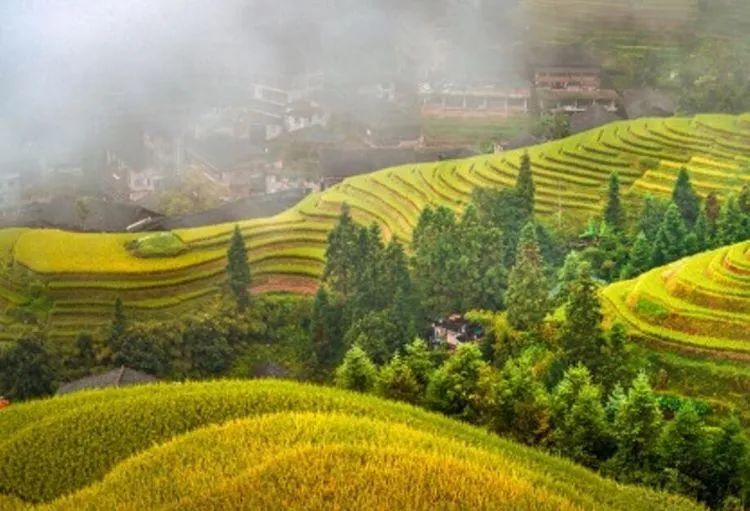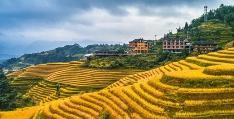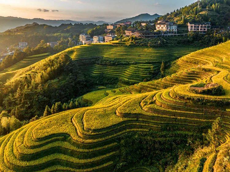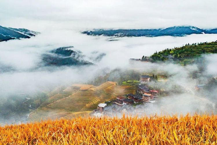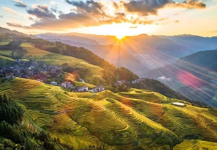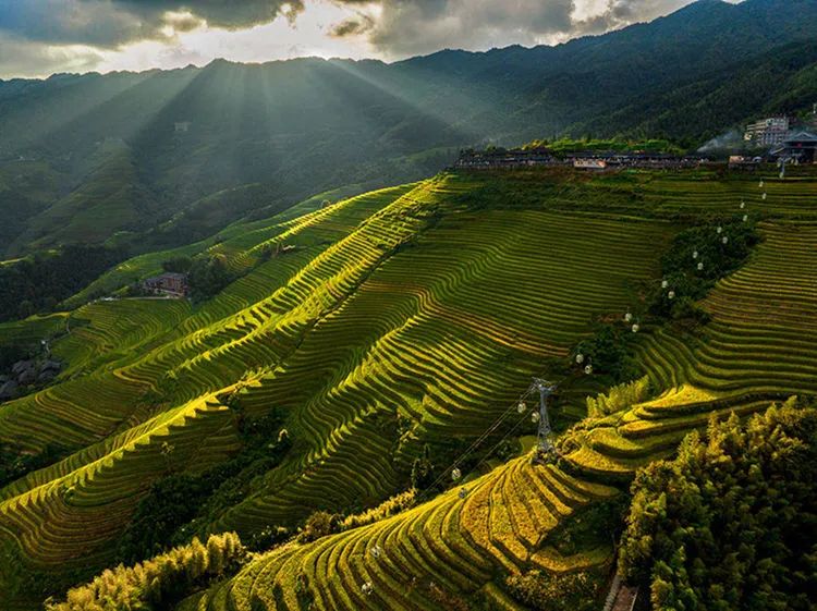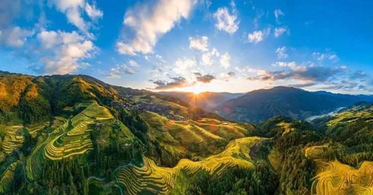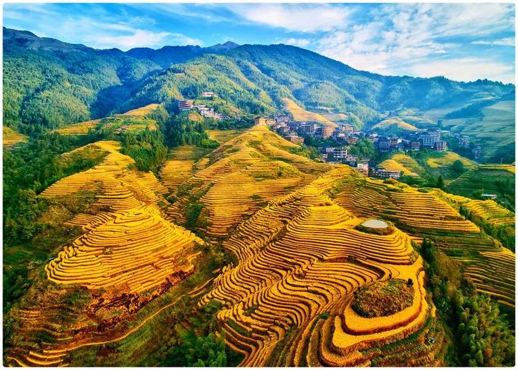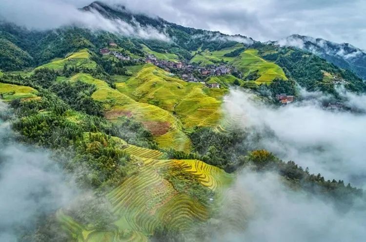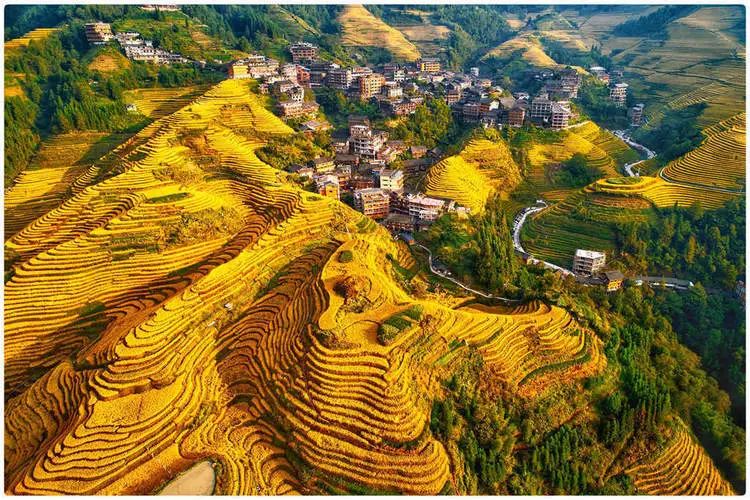 龙脊梯田位于广西龙胜龙脊镇金坑大寨内,距离县城23公里,距离桂林市80公里。每年的金秋时节,龙脊梯田展现出惊心动魄的震撼美,其色彩丰富,有黄有绿,美得让人难以呼吸。秋天的龙脊梯田,稻谷成熟,闪着金光的层层梯田,翠绿与金黄相间,构成了一幅幅美丽的画卷。