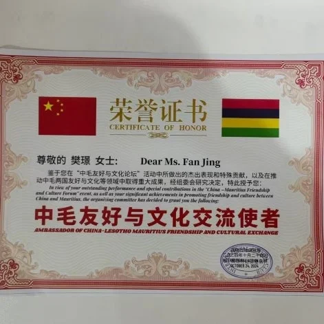 2024年,参加中毛友好与文化论坛获得“中毛友好与文化交流使者”荣誉称号。