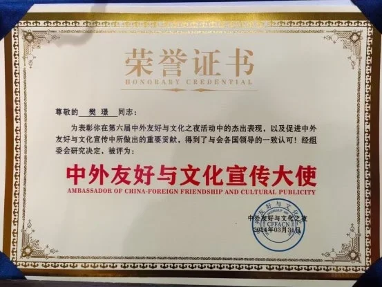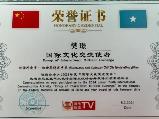 2024年,参加索马里驻华大使馆国际交流活动,获得“国际文化交流使者”荣誉。