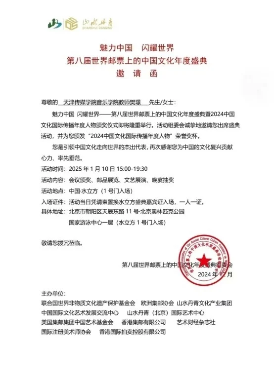2024年第八届世界邮票上的中国文化盛典被评为“国际文化传播年度人物”。