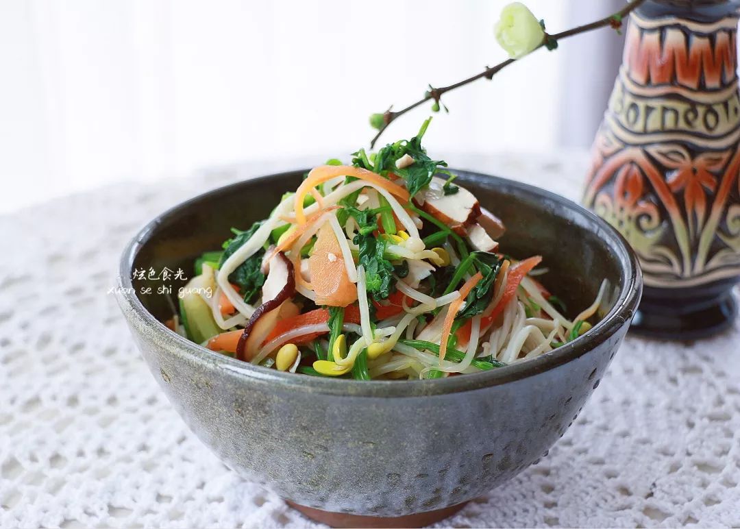 花菜洗净掰成小朵 胡萝卜去皮切成小一点的滚刀块、香菇切块。 素蚝油里加入白糖、黑胡椒粉、淀粉。 加水调和成碗汁。 锅内加水烧开下入胡萝卜煮一分钟。 下入散菜煮开。 下入香菇煮开。 最后下入西兰花煮开。 捞出过一下冷水。 热锅凉油,倒入碗汁煮至开锅。 倒入菜翻炒均匀即可出锅。