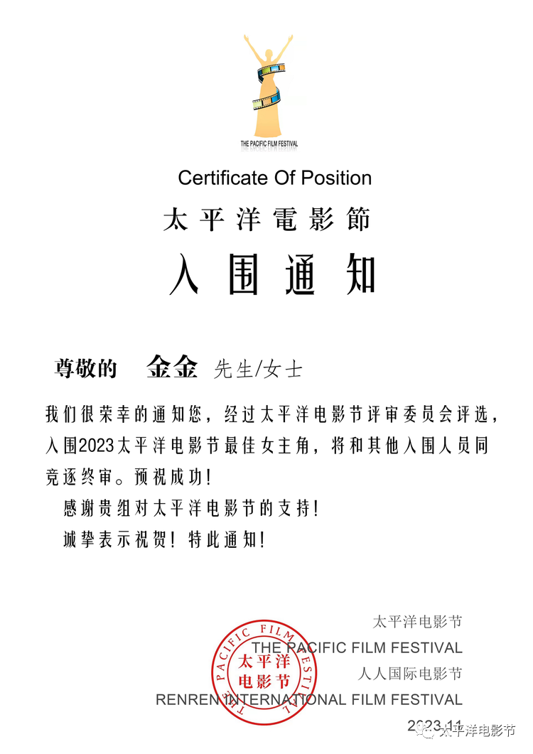 青年演员田茹荣获2023太平洋电影节“金人奖”优秀演员奖