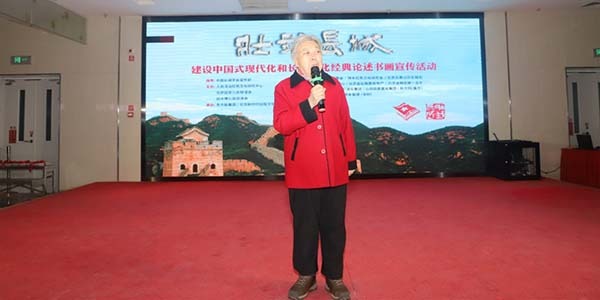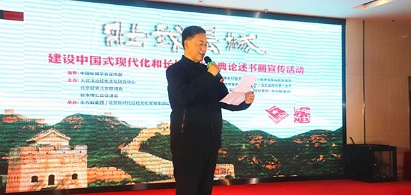 王志国将军对大家说:中国长城学会宣传部指导,人民法治红色文化研究中心、北京延安儿女联谊会、延水情公益促进会主办“壮我长城建设中国式现代化和长城文化经典论述书画宣传活动”,展出人民解放军和武警部队老将军、老军人和军地书法家创作的书画作品406幅,这是一件十分有意义的事情。习近平同志在党的二十大报告中指出:“从现在起,中国共产党的中心任务就是团结带领全国各族人民全面建成社会主义现代化强国、实现第二个百年奋斗目标,以中国式现代化全面推进中华民族伟大复兴。”实践说明,中国式现代化道路,是中国共产党领导全国人民奋力拼搏走出的使我国经济高速发展的正确道路。中国在短短73年时间取得了西方国家经过几百年才取得的现代化成就,让中华民族得以“自立于世界民族之林”,令世界刮目相看。