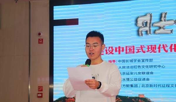 延安延水情公益促进会执行会长、陕北神府佳榆根据地创始人、开国少将王兆相的孙女王溦讲话说,延安延水情公益促进会是刘志丹、谢子长、王兆相等西北革命者后代于2016年在延安注册成立,八年来通过多种组织活动,不断发掘西北革命发展的历史,弘扬延安精神和老一辈革命先辈艰苦奋斗、无私奉献的高贵品质。她回顾了爷爷王兆相在陕北抗大见到毛主席、毛主席对王兆相很关心的情景后说,毛主席是是马克思主义中国化的伟大开拓者,是领导中国人民彻底改变自己命运和国家面貌的一代伟人,毛主席讲得最震撼世界的一句话:中国人站起来了!毛主席更是把人民放在最重要位置,说“人民万岁”!今天我们在此通过书画宣传活动纪念毛主席,希望年轻一代能同我们一样永远铭记先烈的理想志愿,始终如一不忘初心跟党走。我们共同举办“壮我长城书画宣传活动”,就是要坚定信仰之心、忠诚之心、赤子之心,筑牢信仰之基,以昂扬姿态在建设中国式社会主义现代化国家的新征程中,建立无愧于人民、无愧于先辈的业绩!