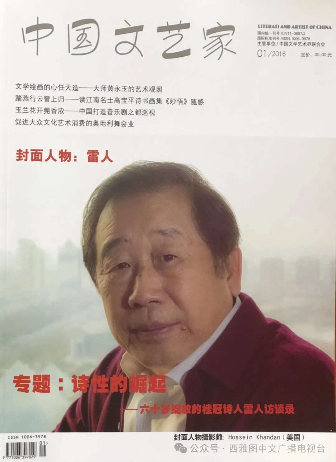 中国文艺家 2016.01期 封面人物,标题是:诗性的崛起——记60岁绽放的桂冠诗人雷人。