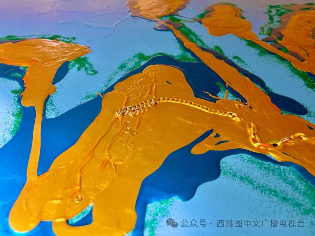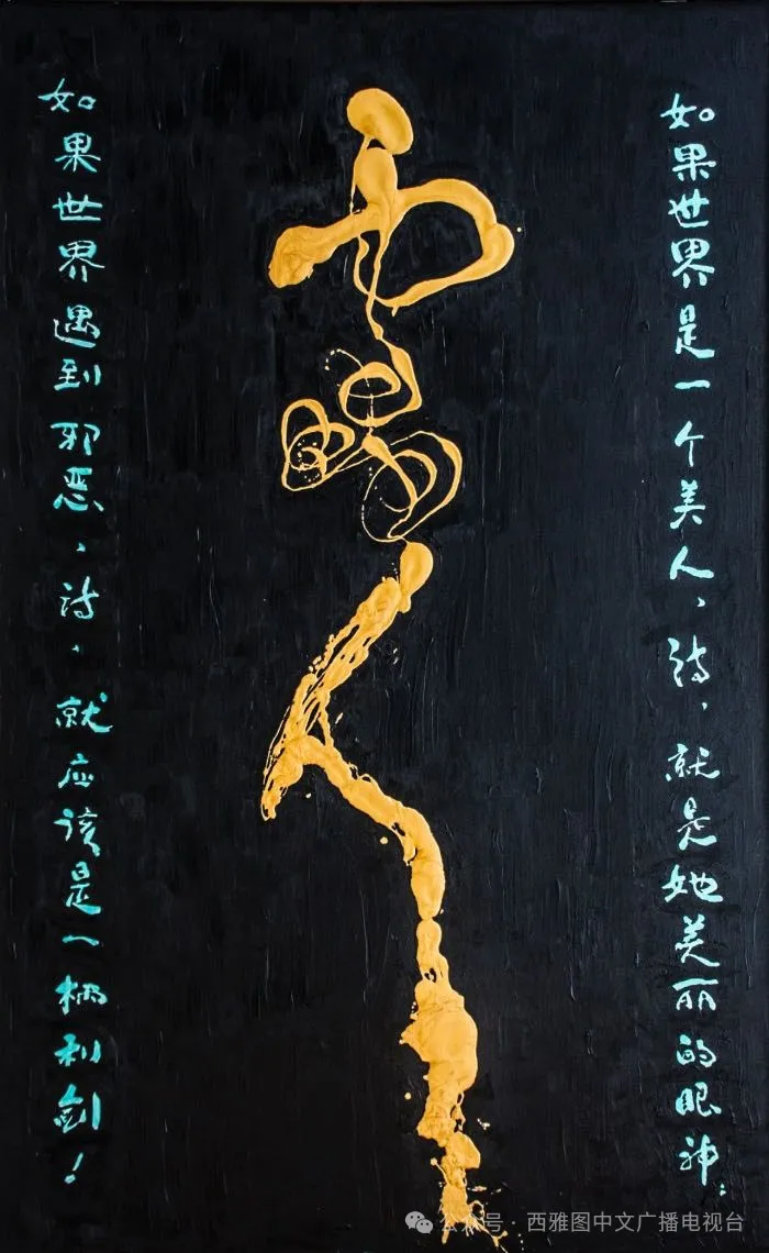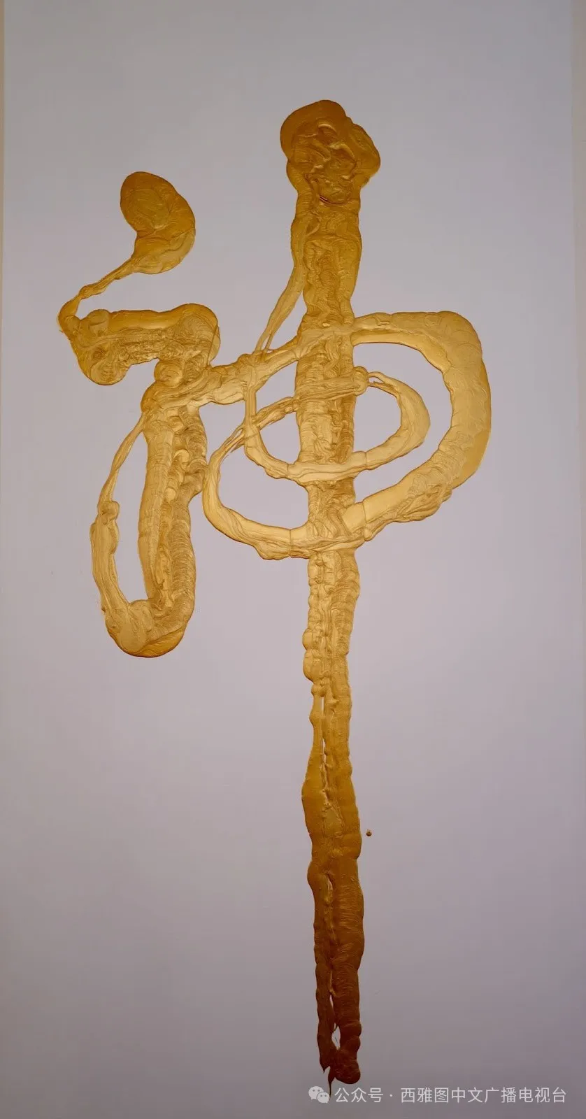 四、雷人先生独创的这种艺术形式,还可以将各种物理材料融入作品中,如金属、宝石乃至个人物品,构成现代综合材料艺术作品。以表达书法之外的更加丰富的主题和画面审美效果。