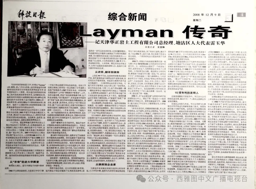 “LAYMAN 传奇——记华正岩土工程有限公司董事长兼总经理雷玉华”,这个标题里用了英语单词laynan。这个词的本义是“门外汉”,标题的意思是说雷人跨界,从一个领域进入另一个陌生的领域,他都把自己从精英变成门外汉,而再从门外汉,变成行业新的精英和领军人物。把这个英文词拆开,Lay谐音雷,man, 其意为人,合起来,就是雷人。这也是雷人笔名的妙用,把英文音译+意译,合成一个中文笔名,而且此名一出,此人一鸣,震耳欲聋。