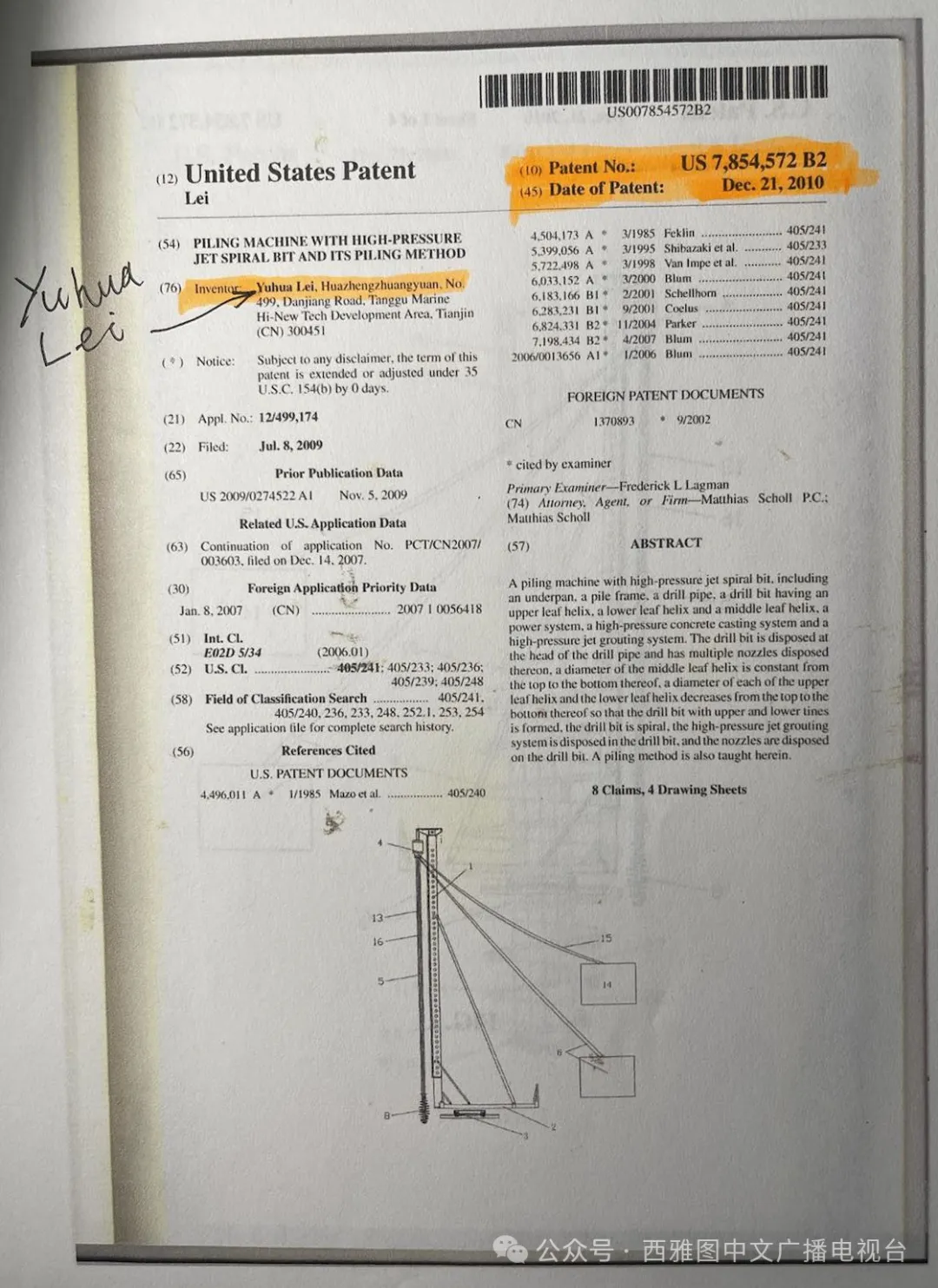除了中国专利,雷人还获得了美国授权的“陀螺钻及其施工工法”发明专利。