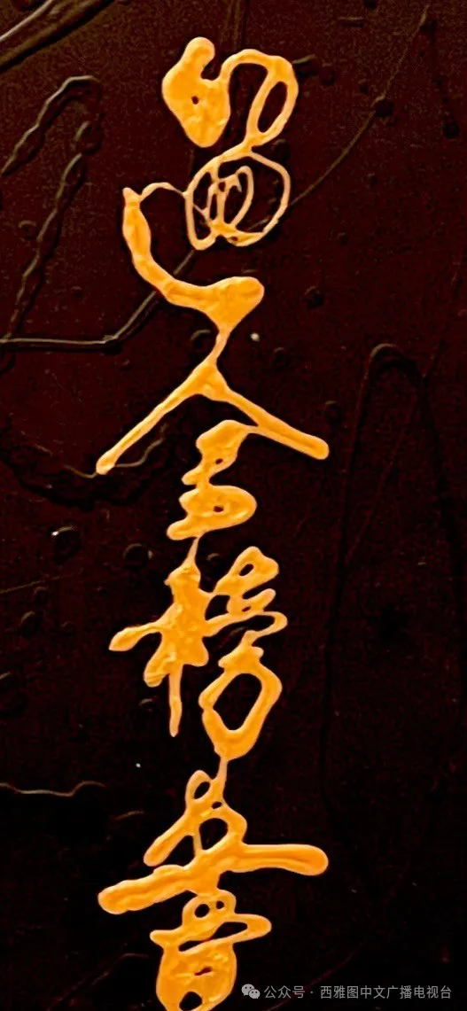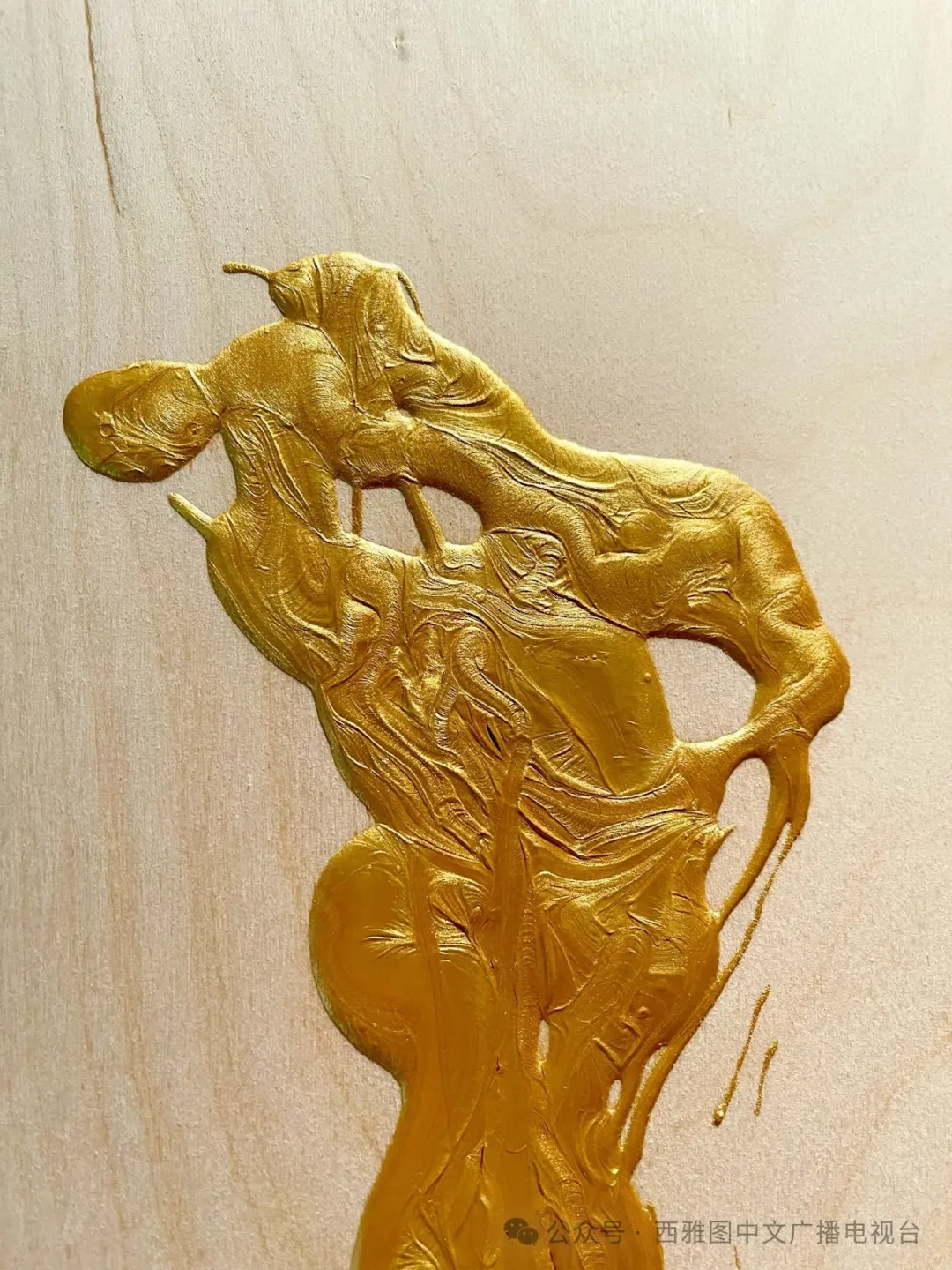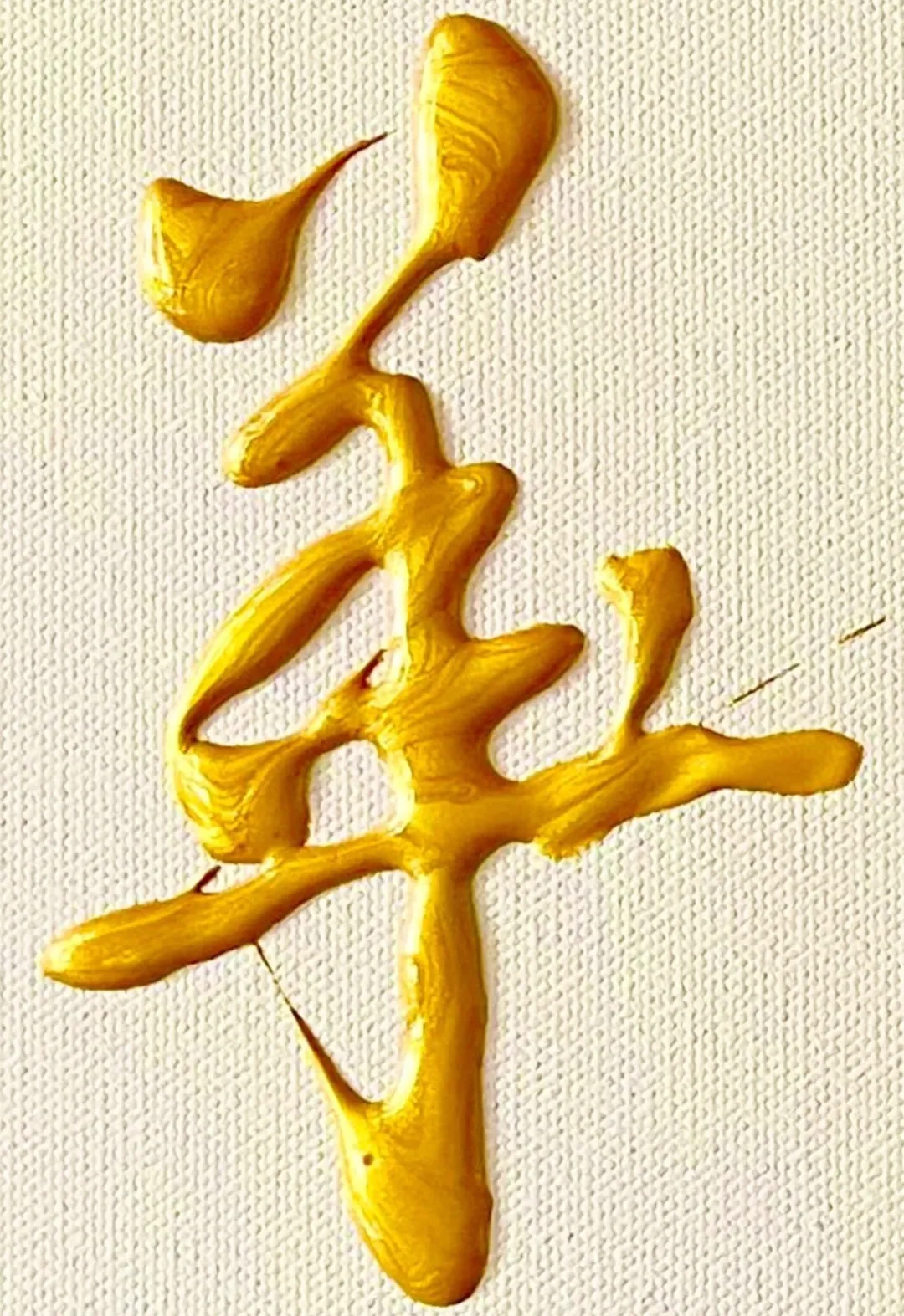 五、遛金立体书法是可以铺垫图案,书法和铺垫叠加,在丙烯自然形成的肌理之上,进一步增加作品笔划内部肌理的立体质感和肌理的丰富感。