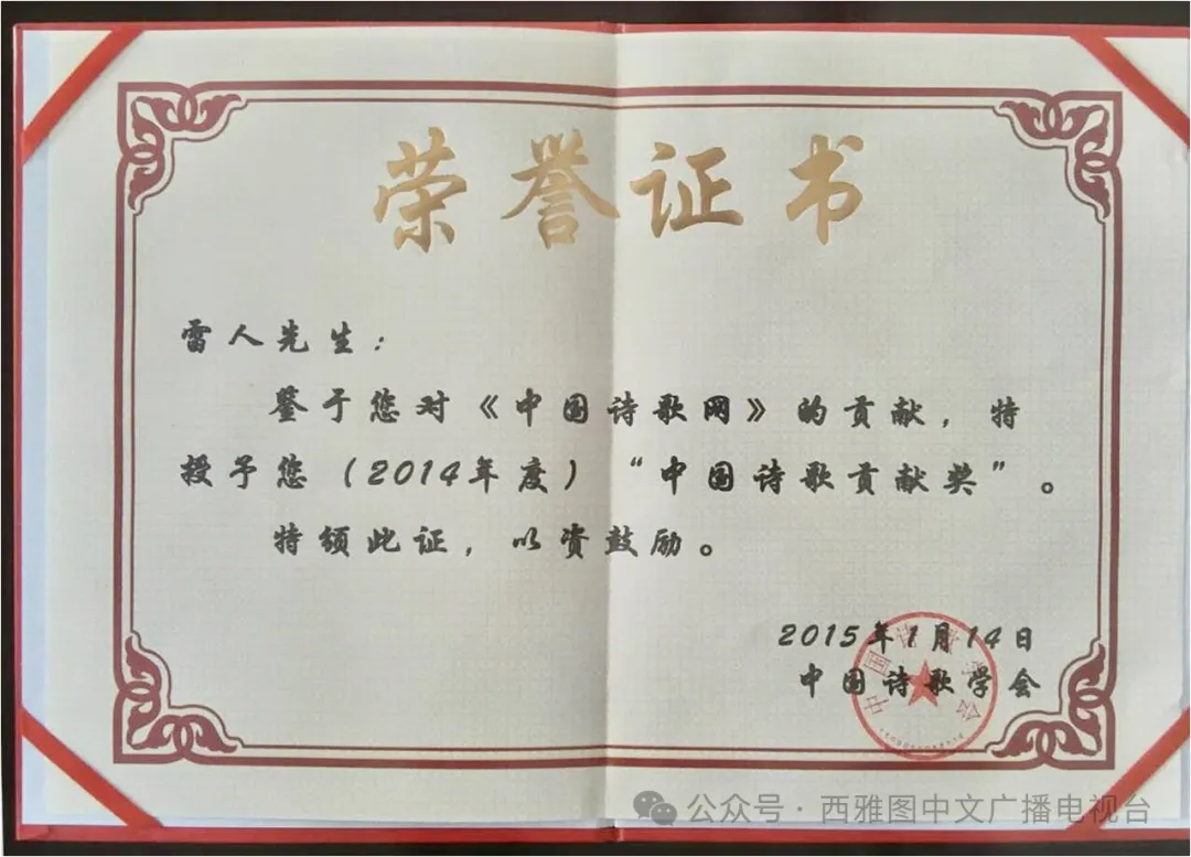 天津渤海周刊报道:雷人获中国诗歌学会“中国诗歌贡献奖” (2014)