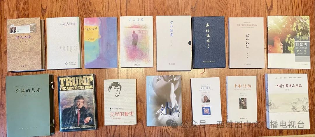 雷人先生出版的中英文诗集8部及诗歌翻译;译著2部:川普自传(1990)、美国长篇小说《红眼睛蓝了》;画作入选《中国百年诗画典藏》
