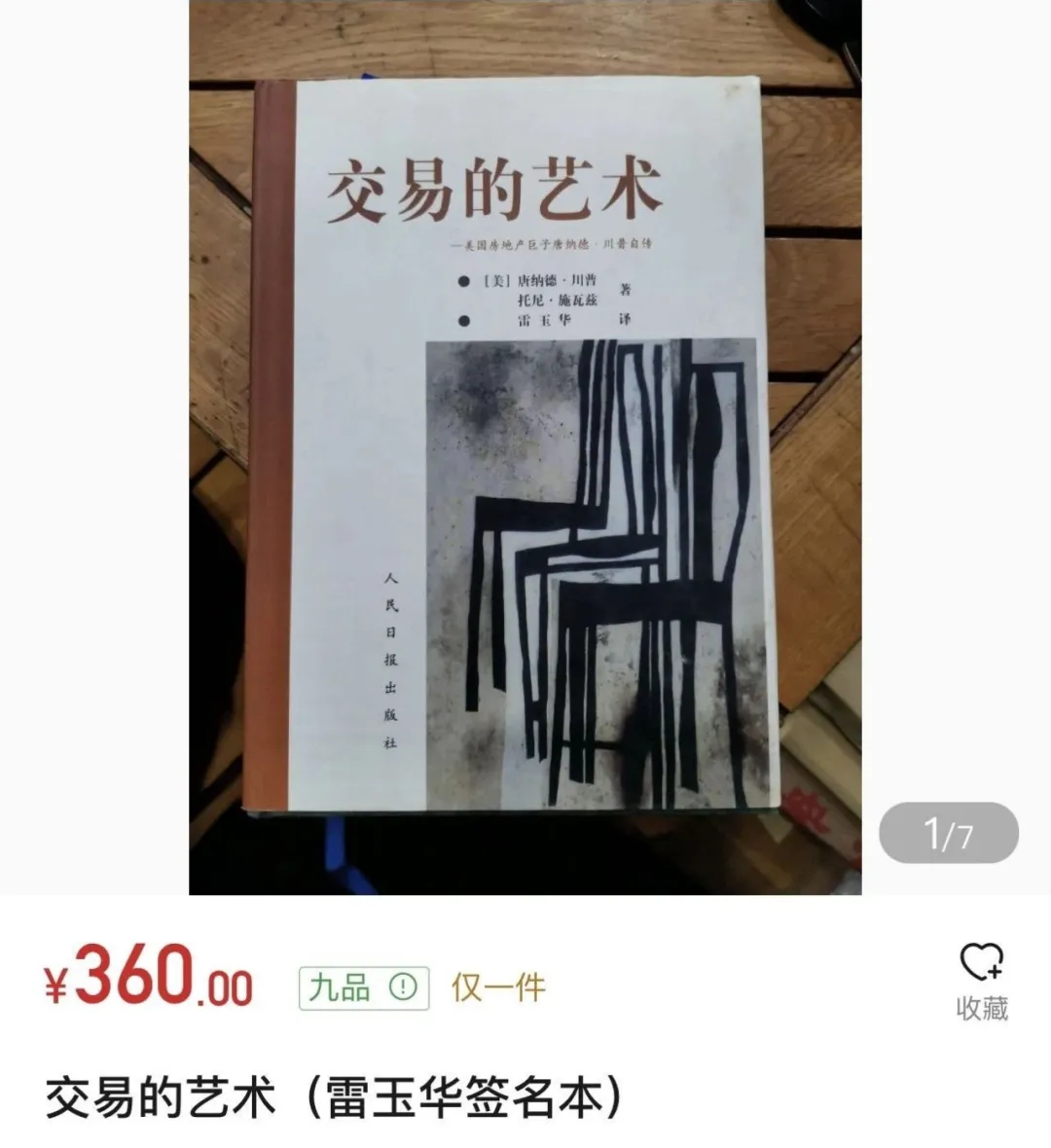 翻译并不奇,奇的是,被翻译界传为佳话的是,雷人自费翻译出版的川普自传,前后5000册,竟然一本没有出售,全部作为个人名片赠送给了朋友。而现在旧书市场上,他签名版的《交易的艺术》却卖到360多元。