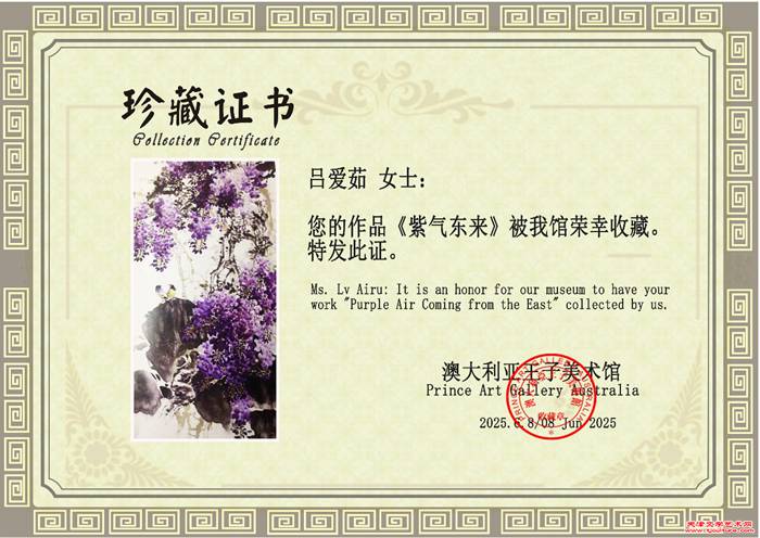 吕爱茹《紫气东来,吉庆有余》被澳洲收藏的证书