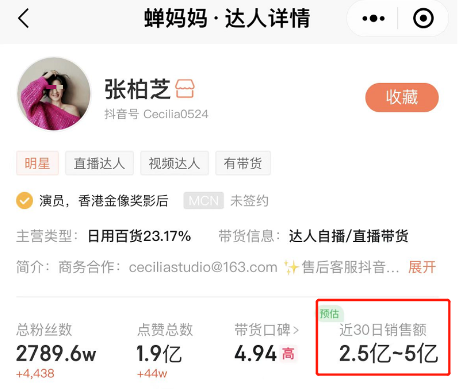 根据公众号平台最新的推送规则,如果不想错过八妹的文章,记得标星标哦,以前加过的也需要重新添加,这样每次新文章推送才会第一时间出现在你的订阅列表里。人生总会有遗漏,但是不要忘记 “添加星标”哦!!!11月1日,张柏芝再次美貌营业,在抖音开启名为“直播1周年柏万回馈”的直播带货。说是回馈,谁都明白这是在瓜分双十一的蛋糕。为了布局今年双十一,张柏芝在10月就进行过3场直播,其中10月13日那场人气鼎沸,销售额超1亿,登顶当天抖音带货榜。加上这场,根据电商数据平台“蝉妈妈”预估,张柏芝4场直播的销售额在2.5亿到5亿之间。不算直播“坑位费”和冠名费,假使按照10个点的“销售提成”,半个多月张柏芝稳赚2500万到5000万,甚至更多。