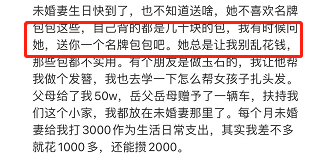 一边,是把父母给的结婚的钱都给了未婚妻保管,让未婚妻买名牌包包;