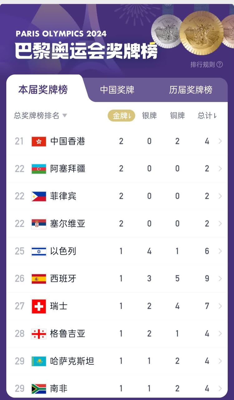 巴黎奥运会金牌榜最新榜单(8月7日)中国代表团22金暂列第一!