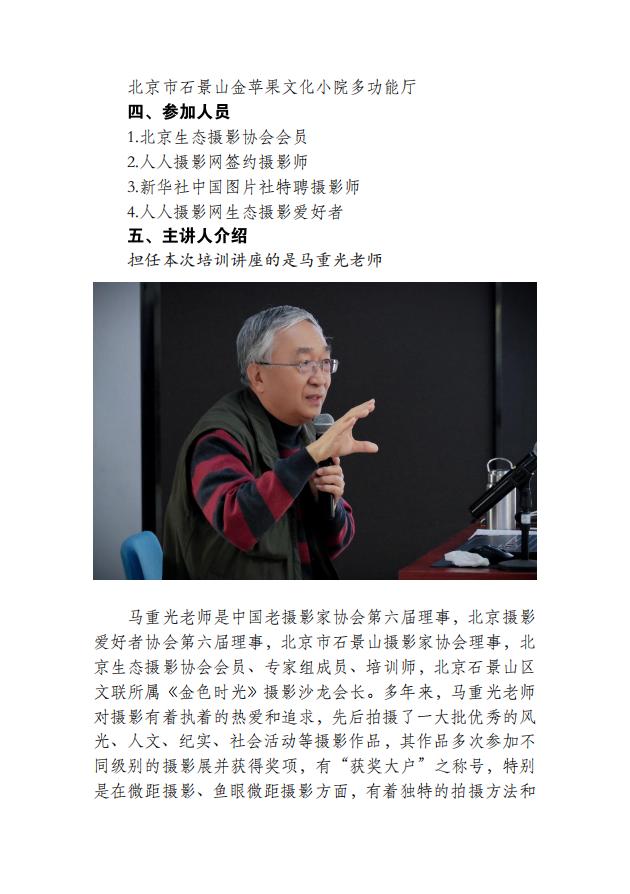 担任本次培训讲座的是马重光老师马重光老师是中国老摄影家协会第六届理事,北京摄影爱好者协会第六届理事,北京市石景山摄影家协会理事,北京生态摄影协会会员、专家组成员、培训师,北京石景山区文联所属《金色时光》摄影沙龙会长。多年来,马重光老师对摄影有着执着的热爱和追求,先后拍摄了一大批优秀的风光、人文、纪实、社会活动等摄影作品,其作品多次参加不同级别的摄影展并获得奖项,有“获奖大户”之称号,特别是在微距摄影、鱼眼微距摄影方面,有着独特的拍摄方法和技巧,其微距作品选题准确,构图严谨,色彩饱满,画面干净,手法细腻,具有很强的冲击力和感染力,展现出较高水准的思想性、艺术性和创造性。