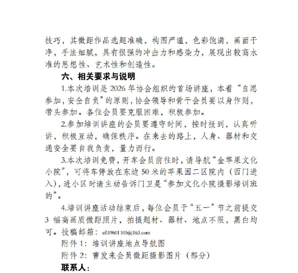 1.本次培训是2026年协会组织的首场讲座,本着“自愿参加,安全自负”的原则,协会领导和骨干会员要以身作则,带头参加。各位会员要克服困难,积极参加。