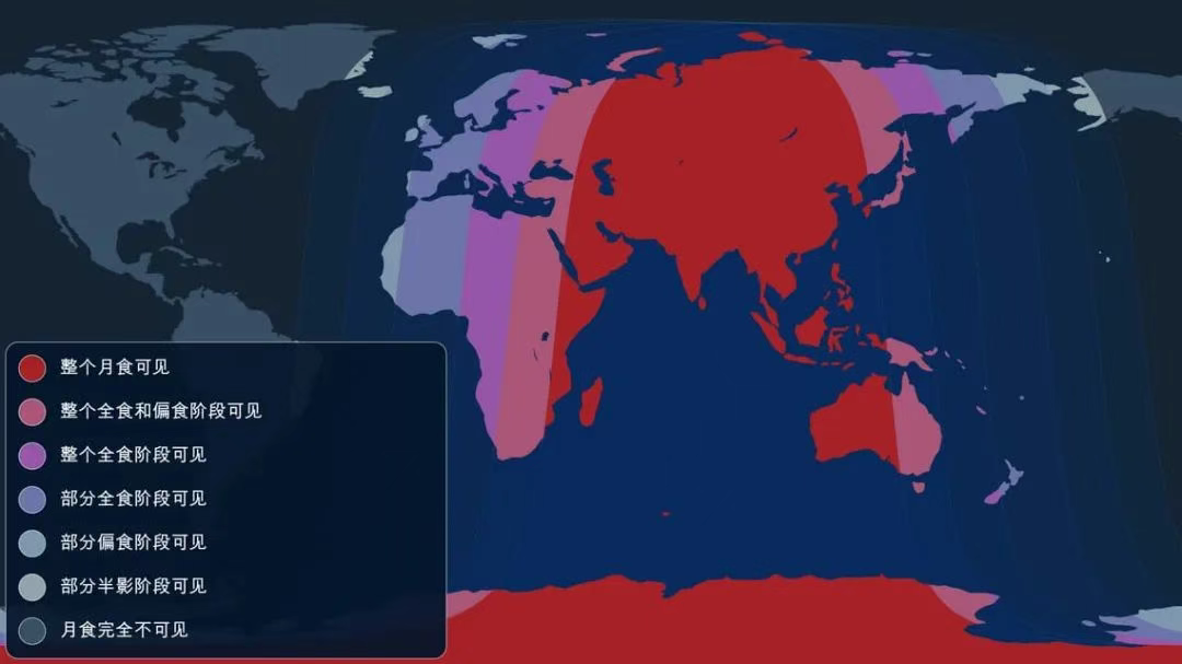 届时月亮将呈现出迷人的红色,也就是我们常说的“血月”。幸运的是,包括我国在内的亚洲大部分地区,都在最佳观测区内。